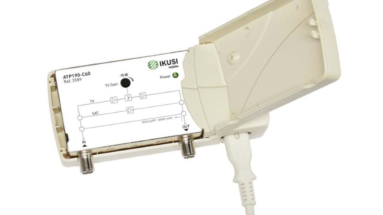 Ο ενισχυτής ATP190-C60 της IKUSI λειτουργεί σε ευρεία ζώνη (47-2400 MHz), διαθέτει ενσωματωμένο τροφοδοτικό (100~240 VAC, 50/60 Hz) και μπορεί να χρησιμοποιηθεί για την ενίσχυση των σημάτων TV & SAT σε μικρού μεγέθους εγκαταστάσεις.